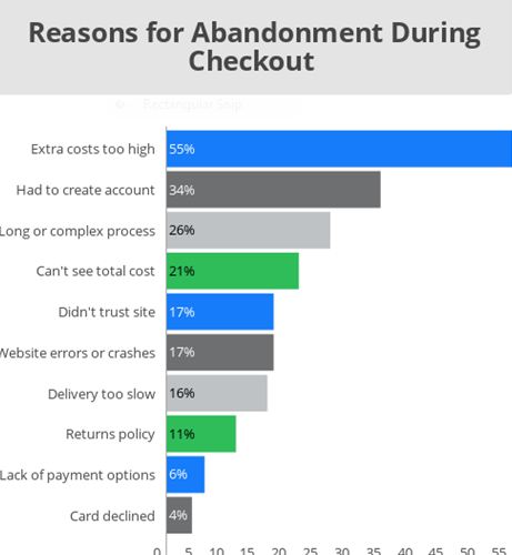 55% of the shopping cart abandonment is due to extra charges like taxation, shipping and other fees. After selecting a specific item with a price mentioned on your site, the customer moves to the checkout page for placing an order.